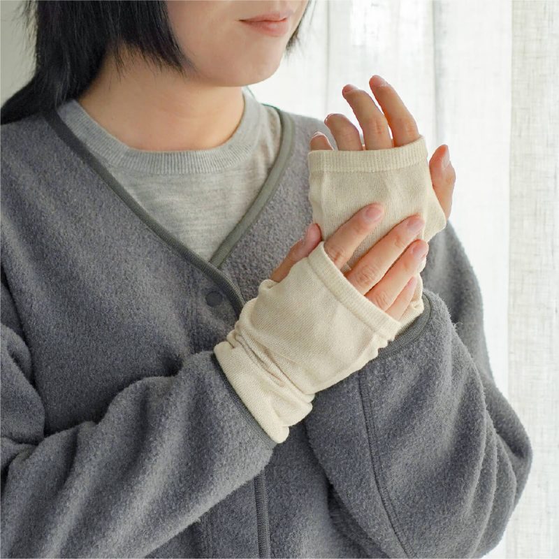 「内側シルク 2重編みアームウォーマー ウール」はゆったりとした作りなので、手元を動かしやすく、手作業が多い方や、オフィスや家事中など、屋内での使用にはとてもおすすめです。