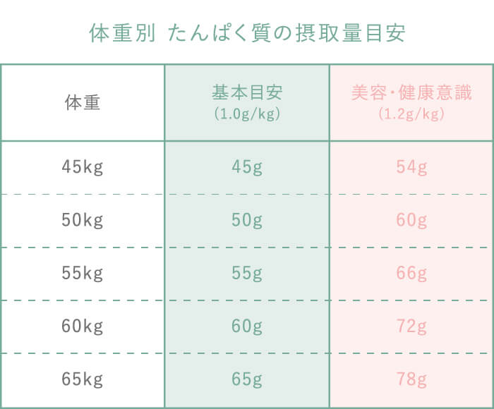 たんぱく質の必要量は「体重1kgあたり約1g」が基本の目安です。美容や健康を意識する方は 1.0~1.2g / kg を目安にすると良いとされています。