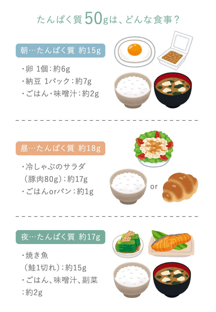 この例を見ると分かるように、たんぱく質50gは卵・納豆・魚or肉が毎食しっかり入っている食事で、ようやく届く量です。