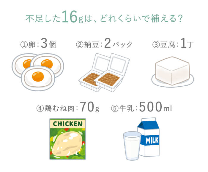 もし、毎食バランスの良い食事でたんぱく質50gを摂れている人でも、美容・健康を意識するなら不足はなんと16g!