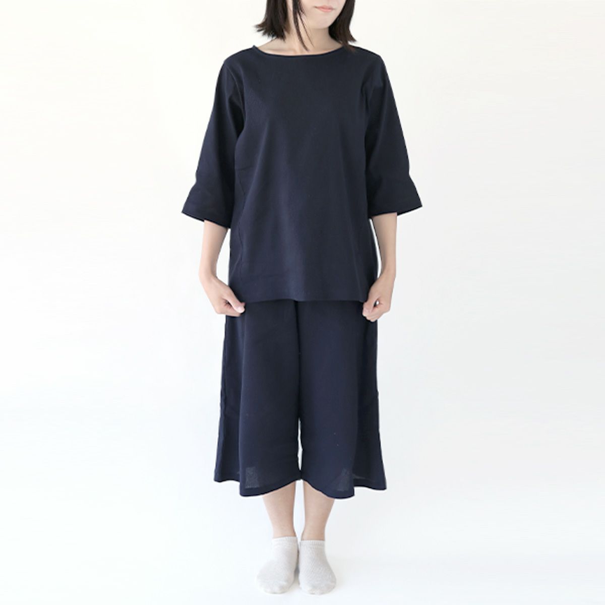 腕や足がエアコンや扇風機で寒すぎないよう、少し長めの丈感に。