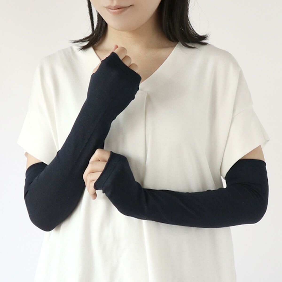 接触冷感のシルクを使用したアームカバー。シルクが汗をしっかり吸・放湿するのでベタつかず、一日中サラッとした着け心地です。