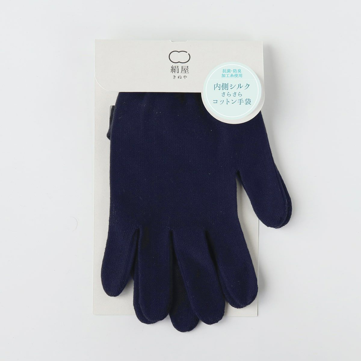 肌に当たる内側はシルク、外側は強撚コットンを使用しました。通気性が良いので涼しく、さらさらのつけ心地です。外出時の電車のつり革や手すりなど衛生面が気になる時にサッとつけてお使いできます。