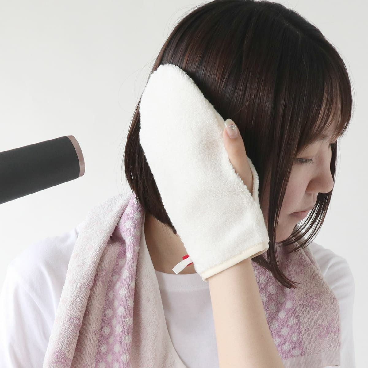 髪を洗って乾かすだけで、髪が傷んでいるのを知っていますか?毎日のダメージから髪を守るために、絹屋コスメは素材にこだわっています。髪の水気をとるタオル面(裏面)には、吸水性が良く摩擦が起こりづらい綿を100%使用し、キューティクルを整えるパイル面(表面)のボアには、髪を様々なダメージから守るシルクを100%使用し、滑らかな手触りのシルクボアとなっています。髪へのダメージ軽減のため、素材にとことんこだわったへアグローブが出来上がりました。