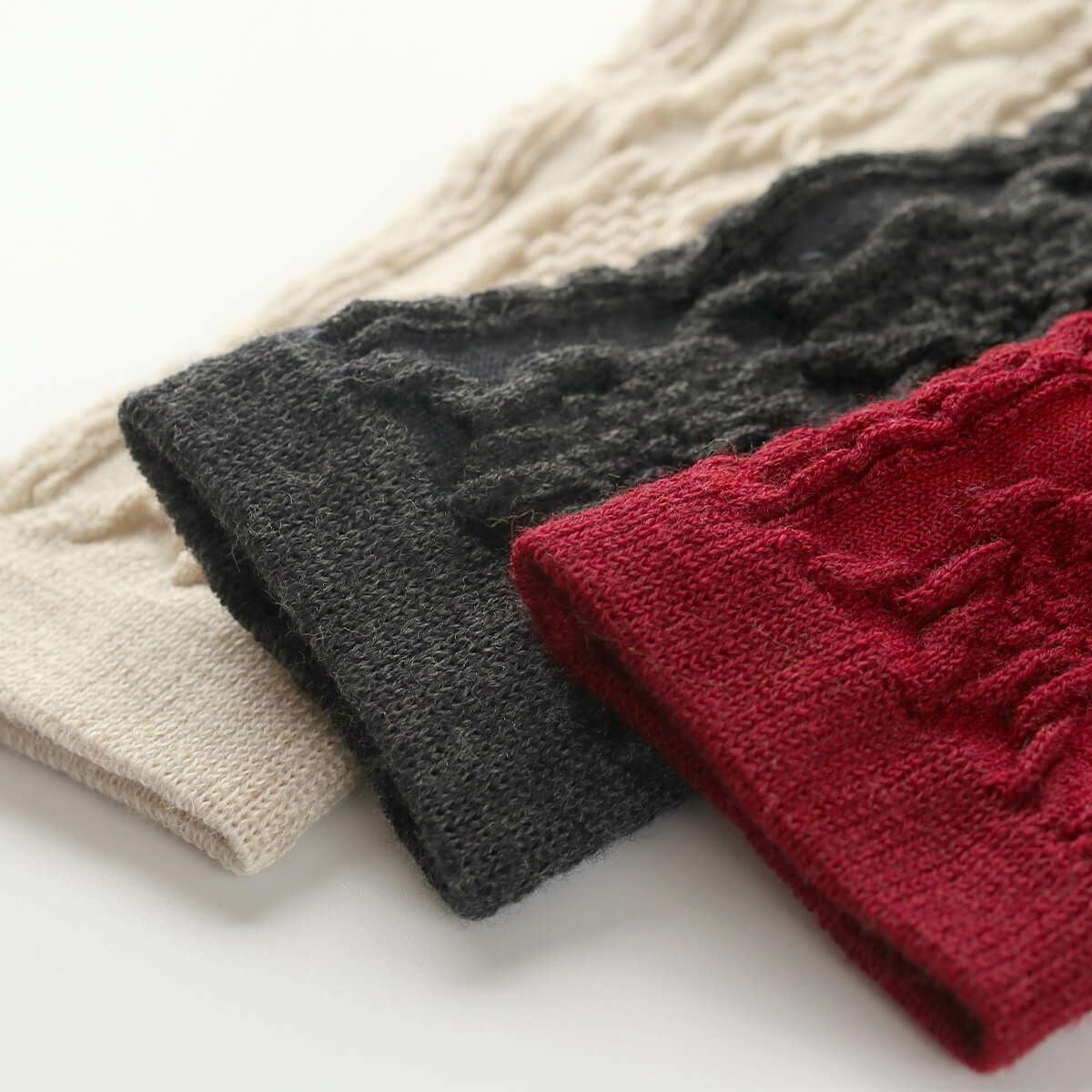 肌に当たる内側にシルク、外側を保温性のあるウールの糸で編み立てました。