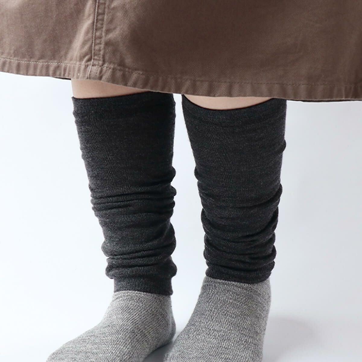 肌に触れる内側はシルク100%、外側はチクチクしにくいメリノウールを使用した、なめらかな肌触りのレッグウォーマー。ズボン下にも履けるほど、薄手でスッキリした見た目ですがシルクとウールの2重構造で、足元をしっかり暖めます。