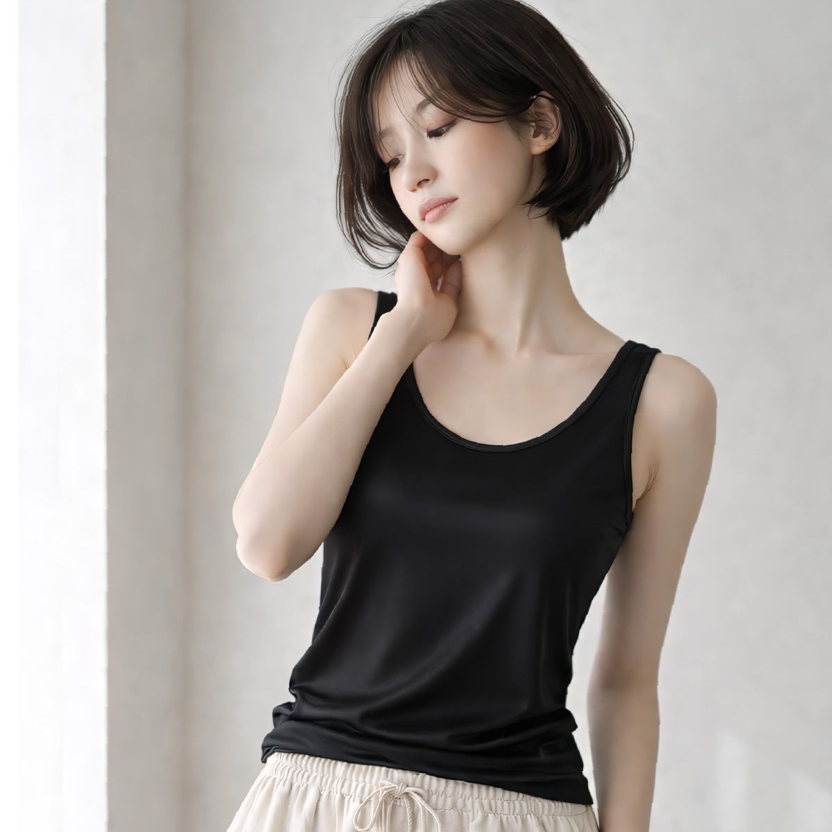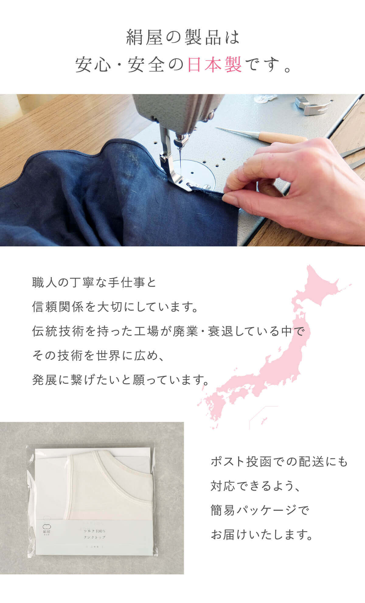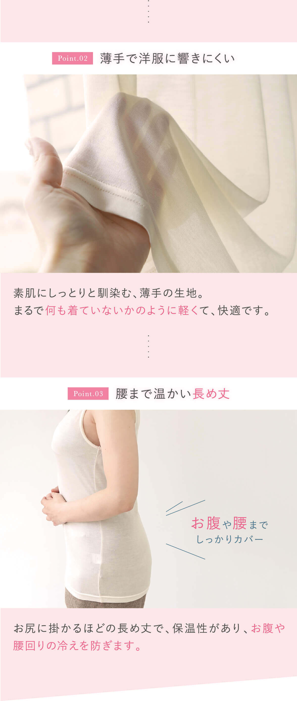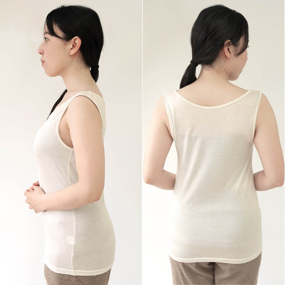A. シルクは保温性にも優れているため、冬は暖かく着用いただけます。ただしこちらのタンクトップは薄手の生地なので、真冬は重ね着の一枚目としてご使用ください。