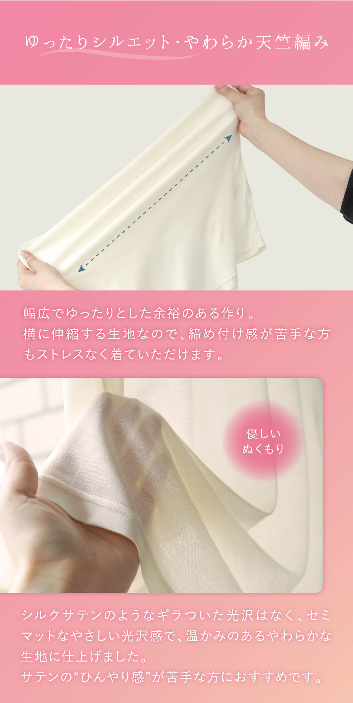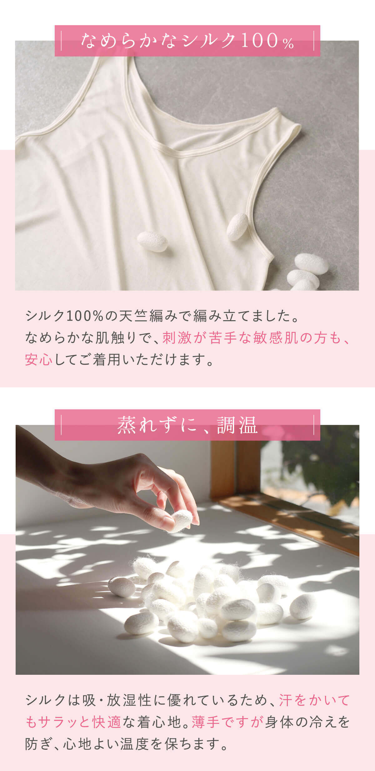 A. シルク100%の生地を使用しています。シルクは吸湿性・放湿性に優れており、汗をかいてもベタつきにくく、オールシーズン快適に着用いただけます。肌あたりもやさしく、敏感肌の方にもおすすめのインナーです。