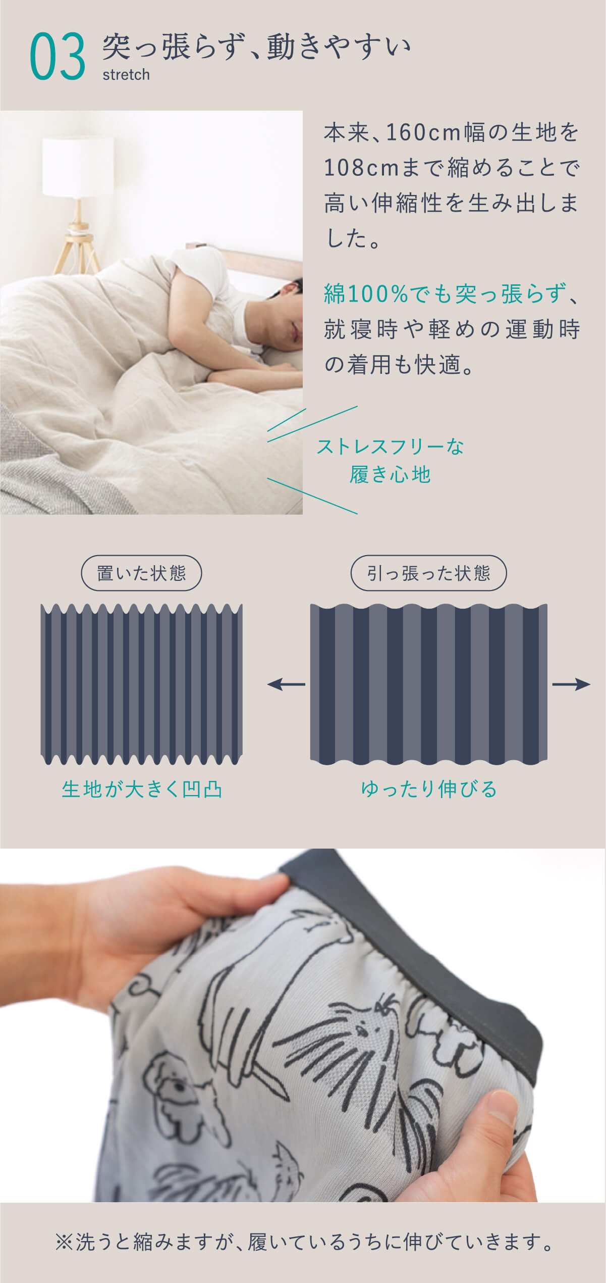就寝時やアウトドアなど、様々なシーンでも快適に過ごせるトランクスです。
