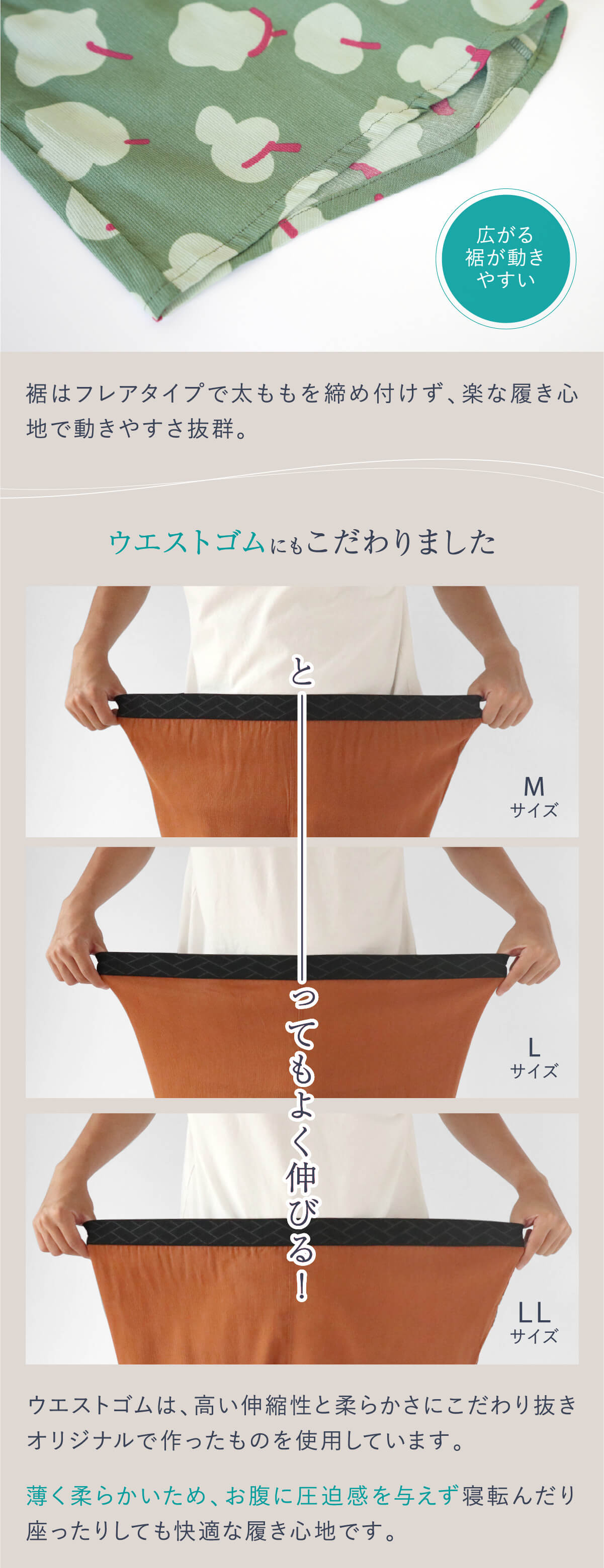 生地の伸縮性と、柔らかいウエストゴムで締め付け感がなく