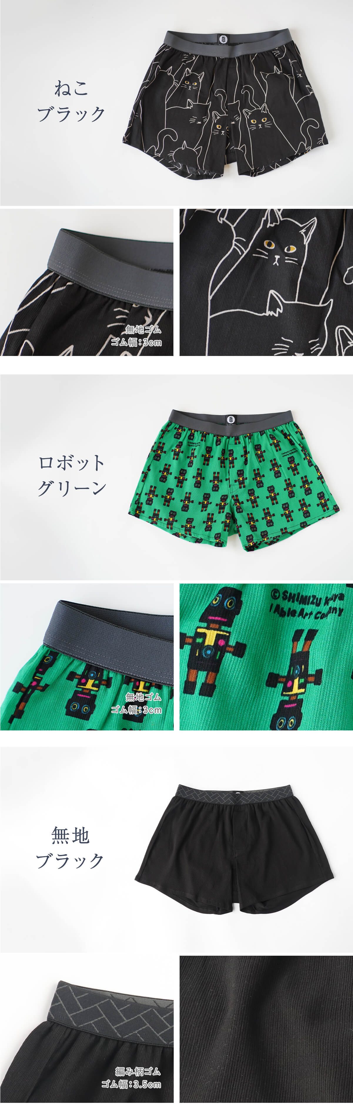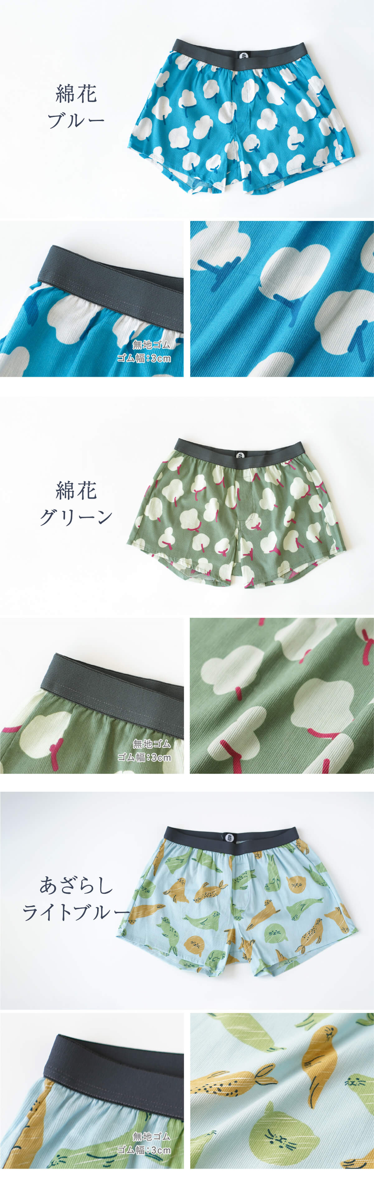 カラー 犬(グレー・イエロー) / 綿花(ブルー・グリーン) / あざらし(ライトブルー・パープル) / ボタニカルガーデン(ネイビー・ブラウン) / ねこ(ブラック) / ロボット(グリーン) / 無地(ブラック・グリーン・チャコール・ネイビー・グレー・ブルー・ピンク・デニムブルー)