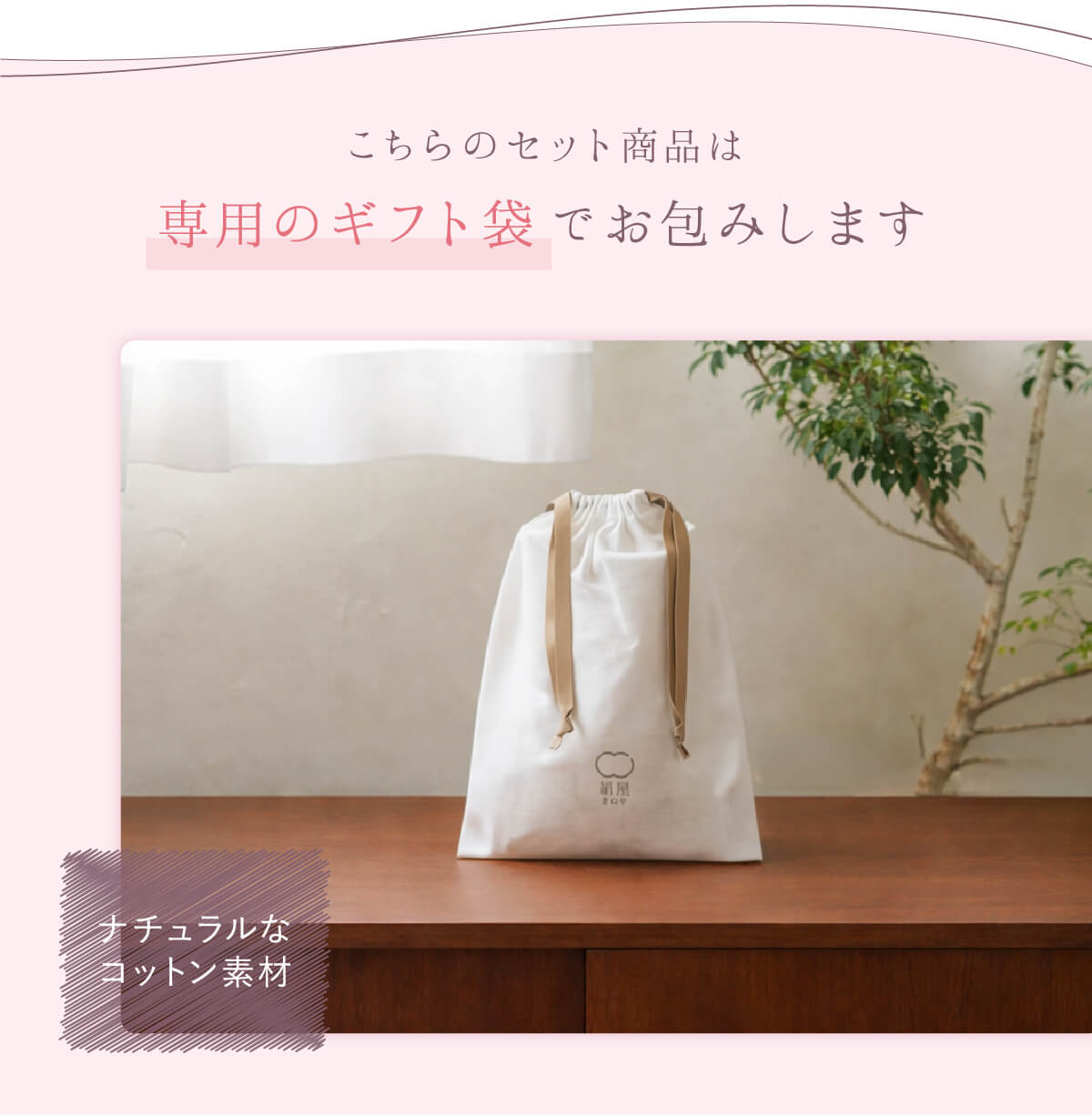 A.ナチュラルなコットン袋を使用しています。綿100%でやわらかな袋で、保存用袋や小物入れやお化粧ポーチとしても役立ちます。