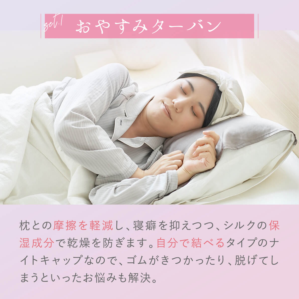 A.枕との摩擦をやわらげ、寝ぐせや髪のダメージを軽減します。また、シルクの保湿性により乾燥を防ぎ、しっとりとした状態を保ちます。