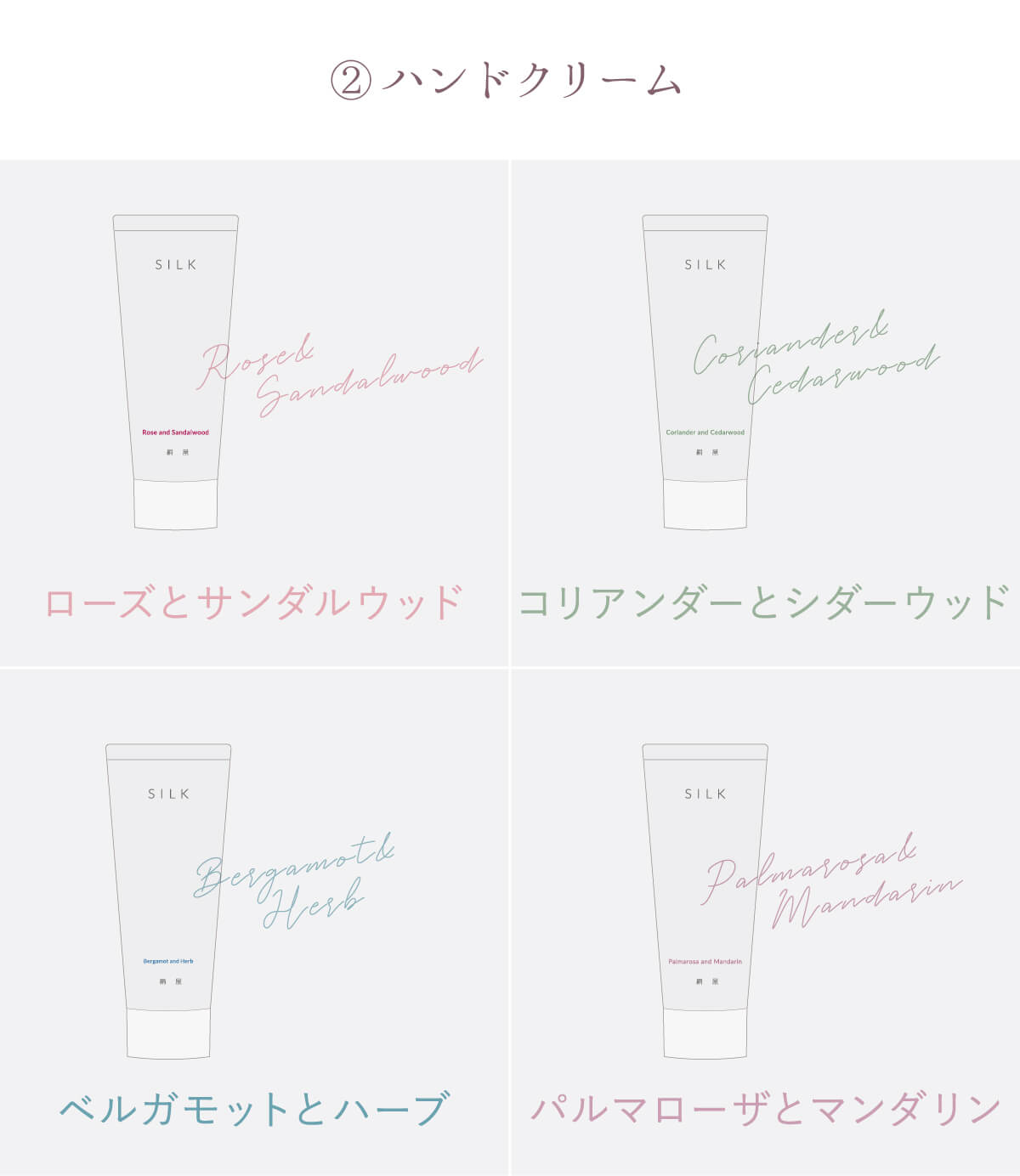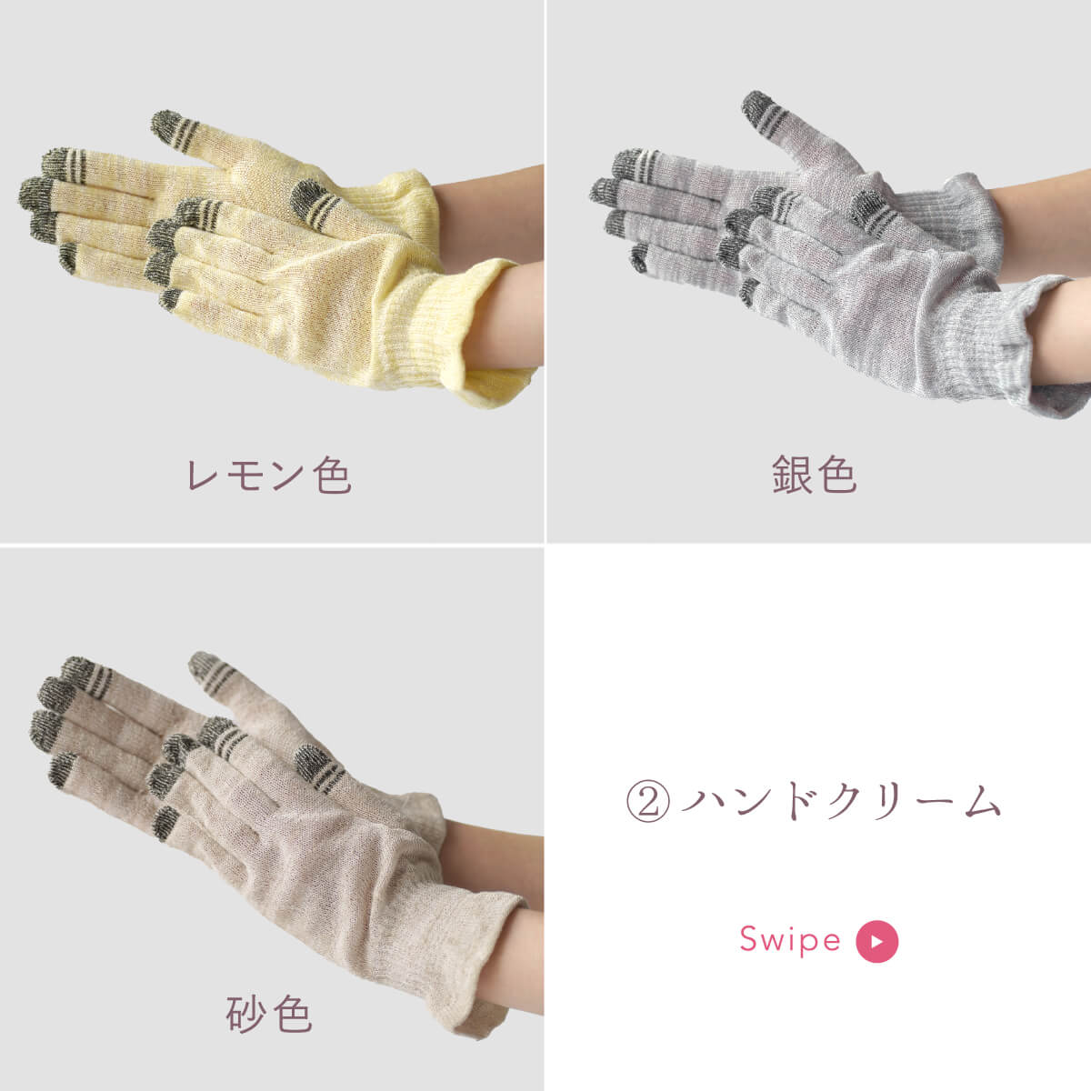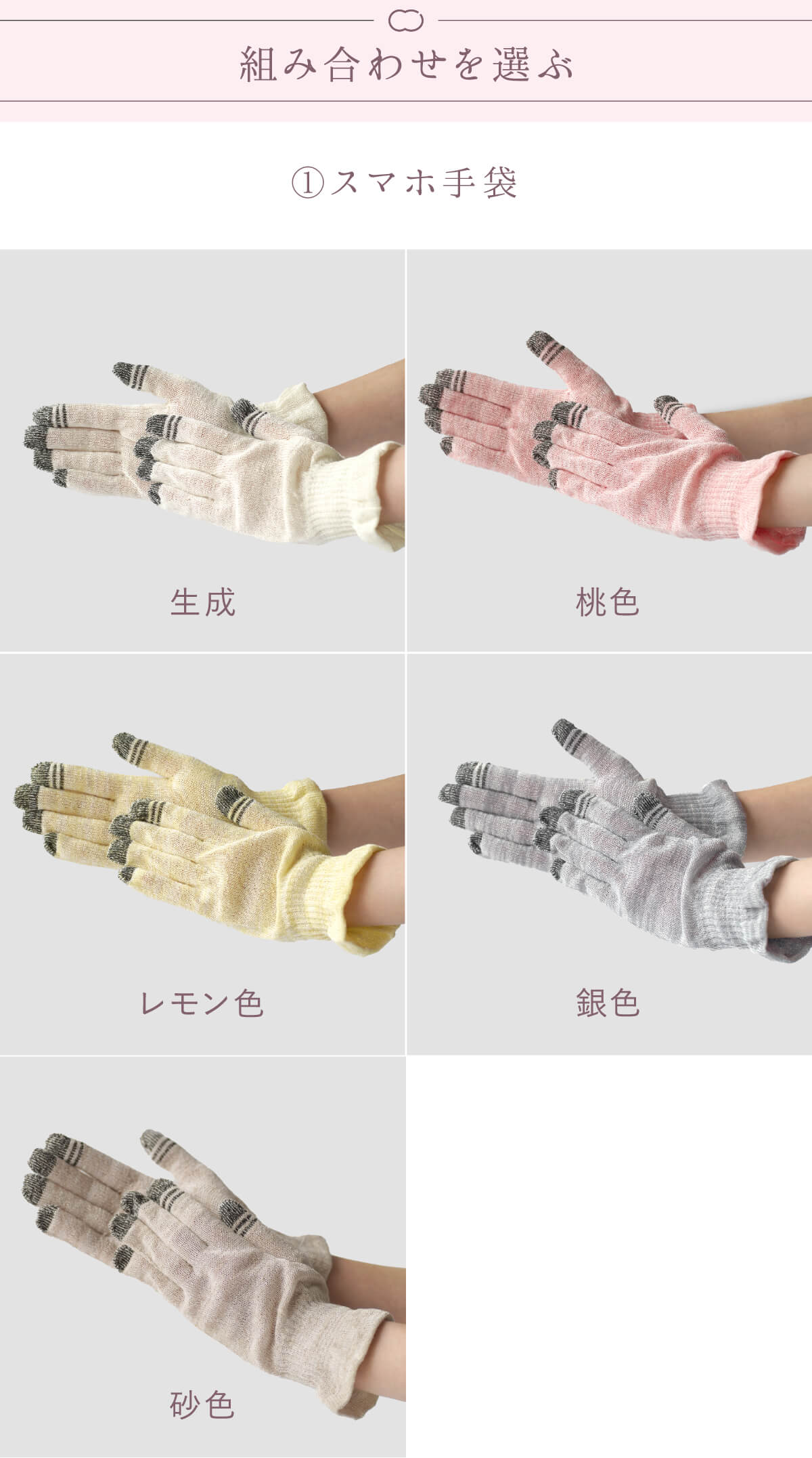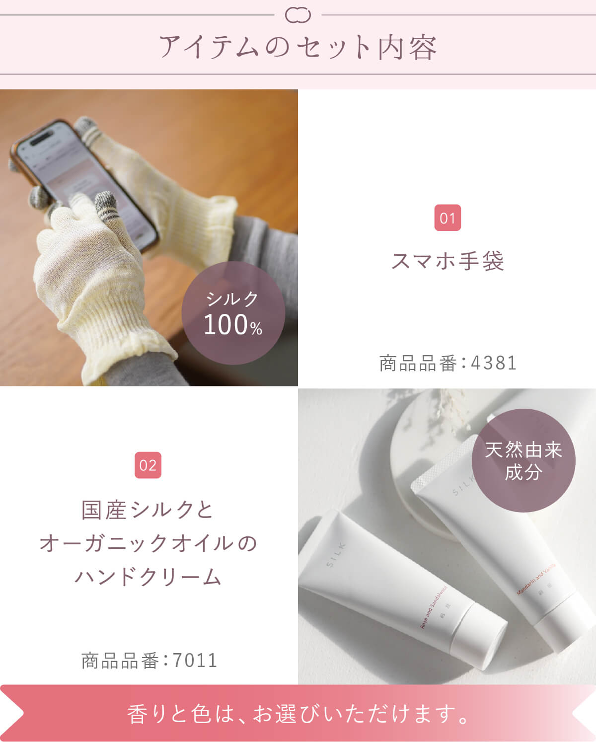 カラー/香り スマホ手袋:生成、桃色、レモン色、銀色、砂色 ハンドクリーム:ローズとサンダルウッド、ベルガモットとハーブ、コリアンダーとシダーウッド、パルマローザとマンダリン