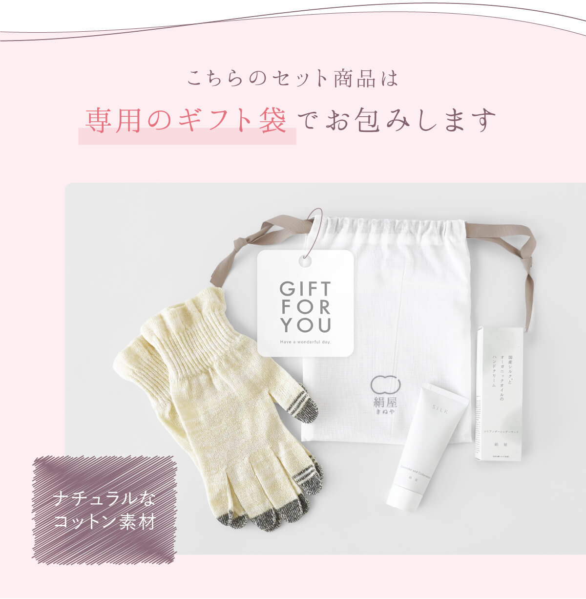 就寝時に手袋をつけると優しい温かさで「入眠がよくなった!」というお声もいただいております。ハンドクリームはアロマ効果も期待できる天然香料の香り。使っていただくことでリラックスもできる贈り物です。