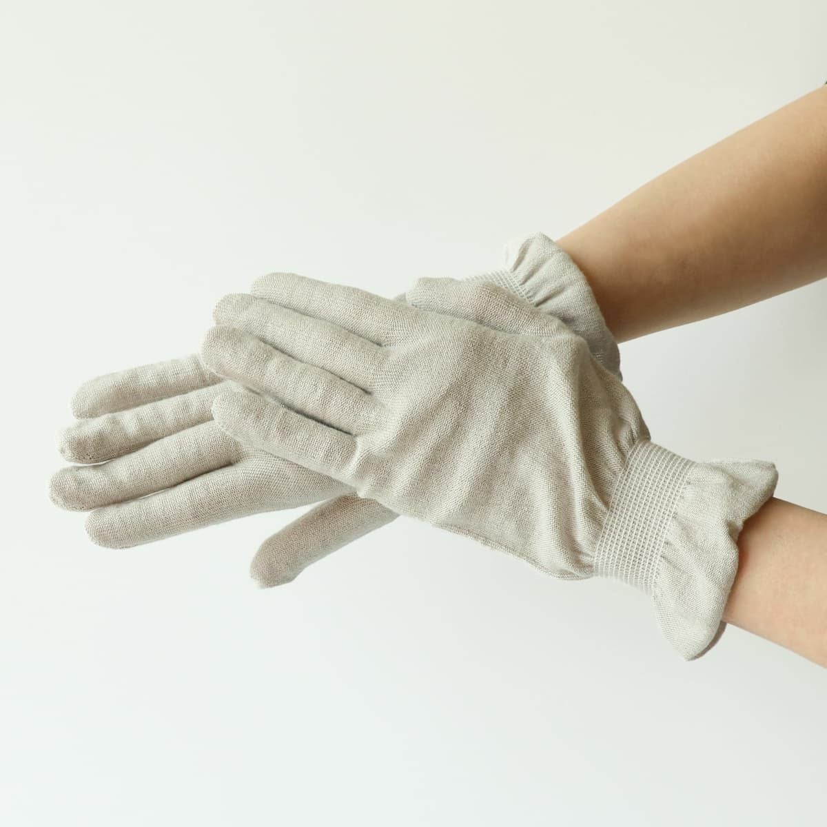 綿の風合いとレーヨンのぬめり感のある糸が編んだ手袋。この手袋には天然有機系デオドラント加工「ロンフレッシュ🄬」が付与されており、抗菌防臭の効果が期待できます。またUVカット率が90%を越えているため、日焼けの心配もありません。小さくてコンパクトに持ち運べるのでどんな時も便利に使えます。