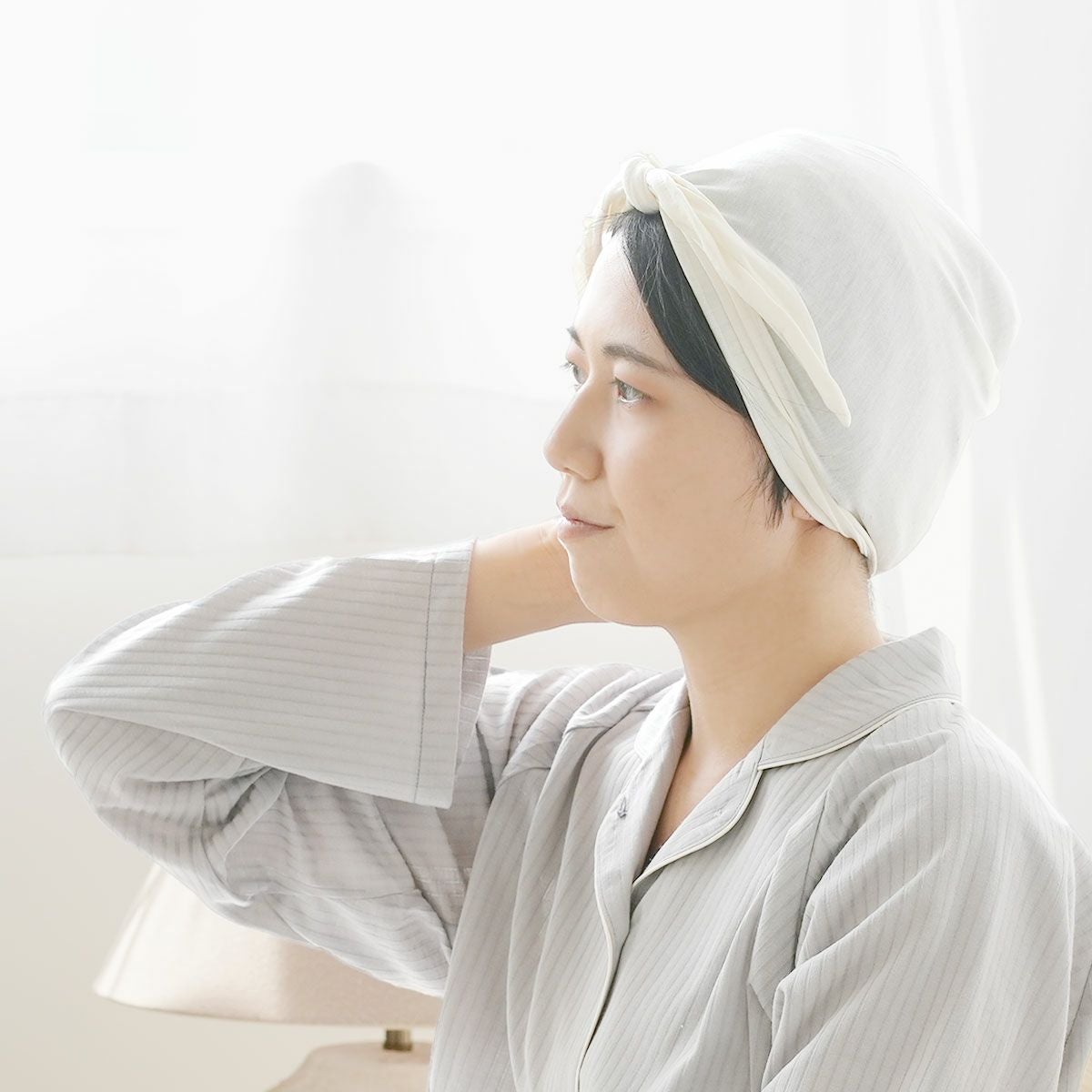 人生で初めてナイトキャップを購入しました。 髪の毛がパサパサなのは髪質なのかと思っていましたが、このおやすみターバンをつけて寝た翌日は髪の毛がしっとり!部屋の感想に髪の毛の水分が持っていかれてたのだと実感しました。 寝ている間のヘアケアも大切ですね。 愛用させていただきます!