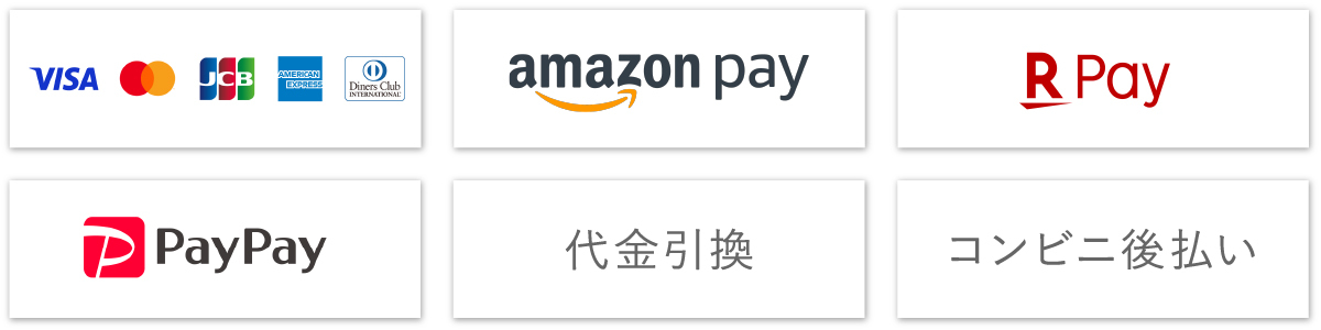 クレジットカード、代金引換、「前払い」銀行振込、コンビニ後払い、Amazonpay、楽天ペイ、paypay、aupayがご利用になれます。詳しくは「お支払いについて」のページをご利用ください。