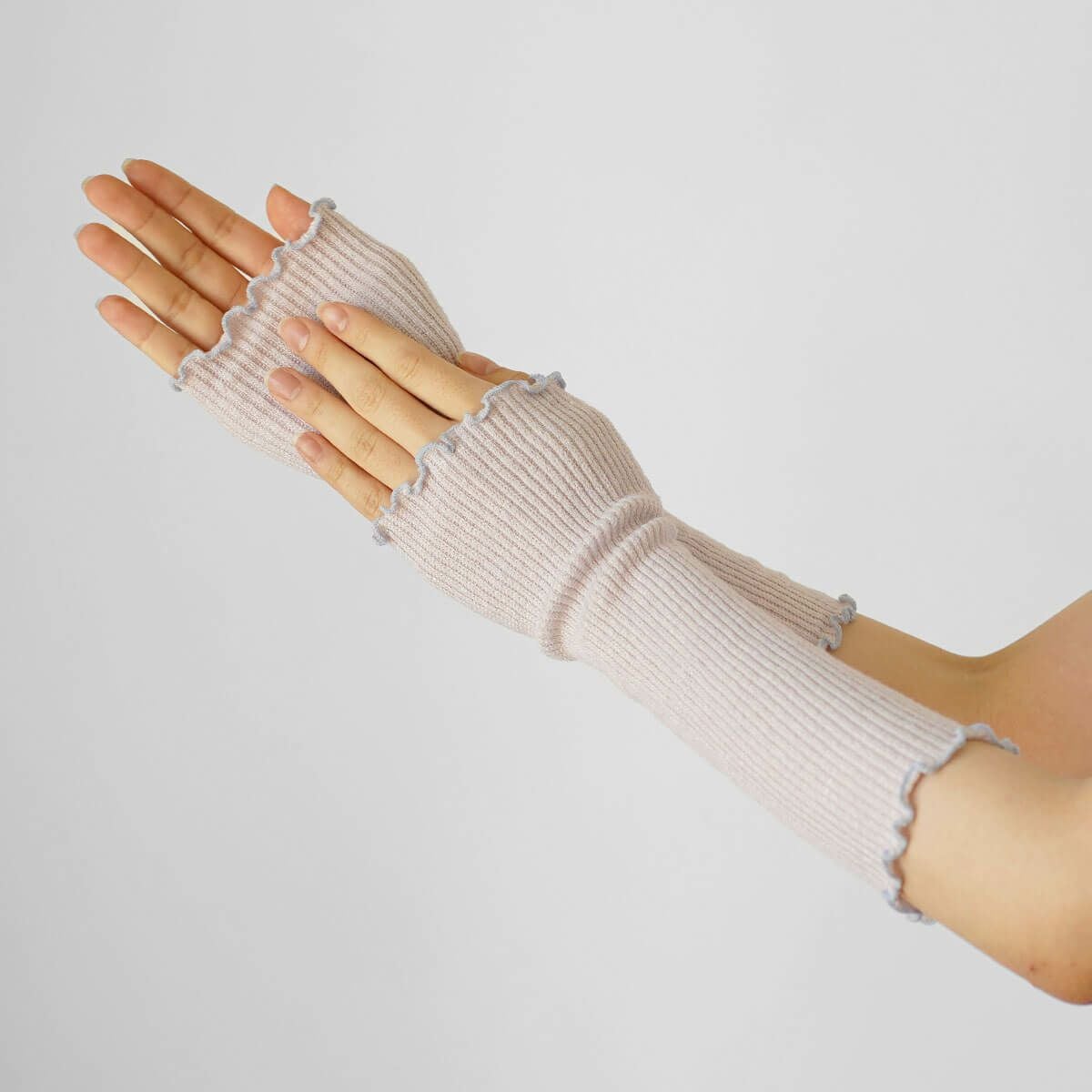 シルクと綿の柔らかなアームウォーマーです。リブ編みで非常に伸びがよく、 腕の太さに合わせてふんわりフィットします。長さはセミロング丈で、肘下までカバー。冷房・季節の変わりめの寒さ対策など、季節を問わず使えます。