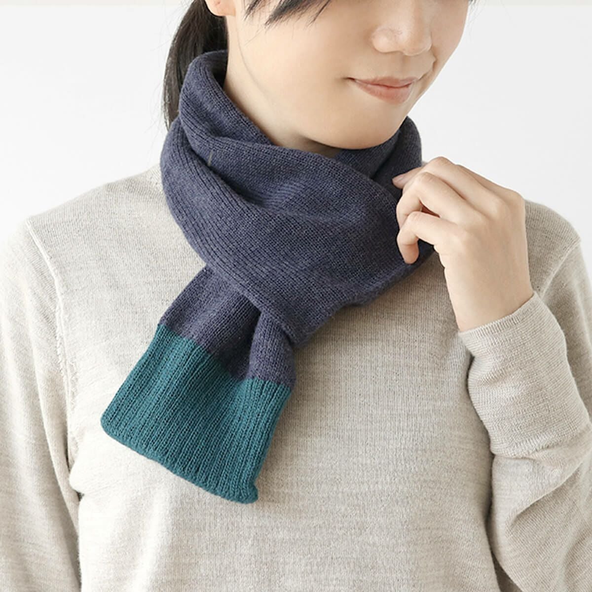 肌に当たる内側にシルクを使用し、チクチク感のない優しい肌触り。外側は保温性のあるウール・カシミヤ混で、首元を冷えから守ります。
