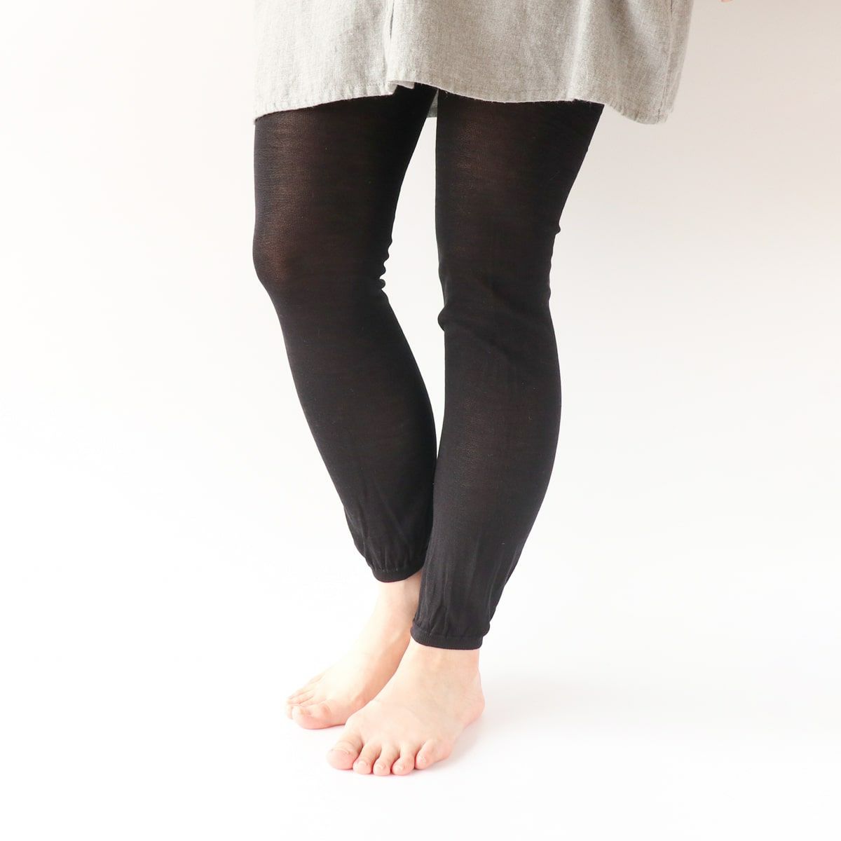 パンツと重ねて履いても使用できる薄手のレギンス。 シルクの中でもつるつると光沢のある絹紡糸を使っているため、滑らかな履き心地です。 足の付け根から足先までは、絹紡糸でガーゼ編みになっているのでシルク100%です。 寒い時期には、重ね履きのレギンスとして、暖かい季節には1枚で。年中履ける優しいレギンスです。