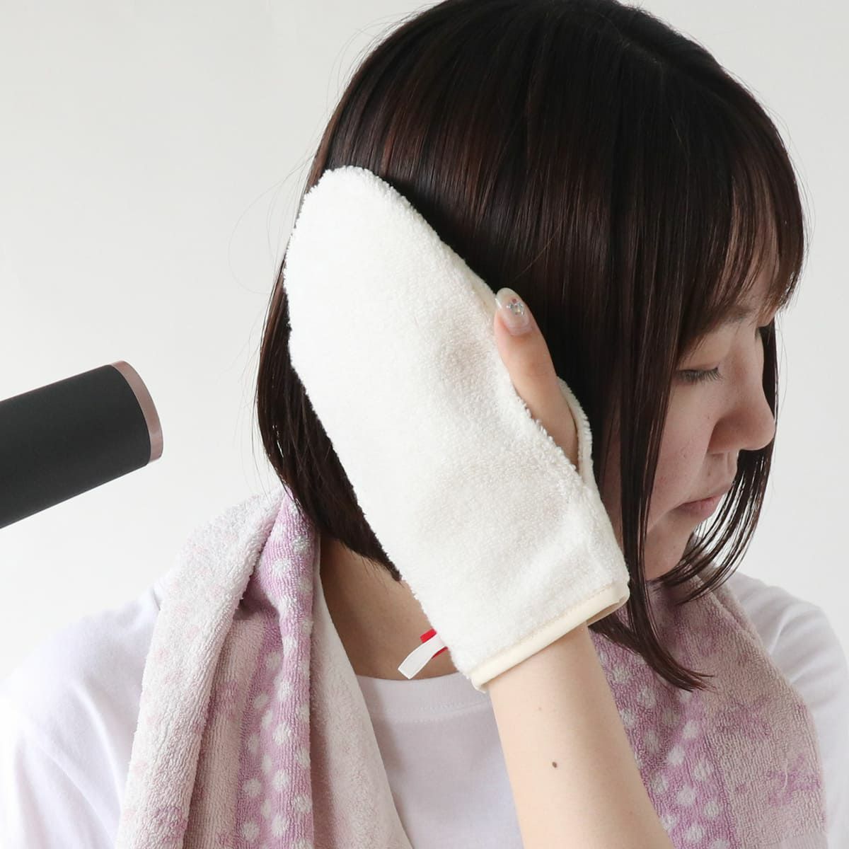 髪を洗って乾かすだけで、髪が傷んでいるのを知っていますか?毎日のダメージから髪を守るために、絹屋コスメは素材にこだわっています。髪の水気をとるタオル面(裏面)には、吸水性が良く摩擦が起こりづらい綿を100%使用し、キューティクルを整えるパイル面(表面)のボアには、髪を様々なダメージから守るシルクを100%使用し、滑らかな手触りのシルクボアとなっています。髪へのダメージ軽減のため、素材にとことんこだわったへアグローブが出来上がりました。