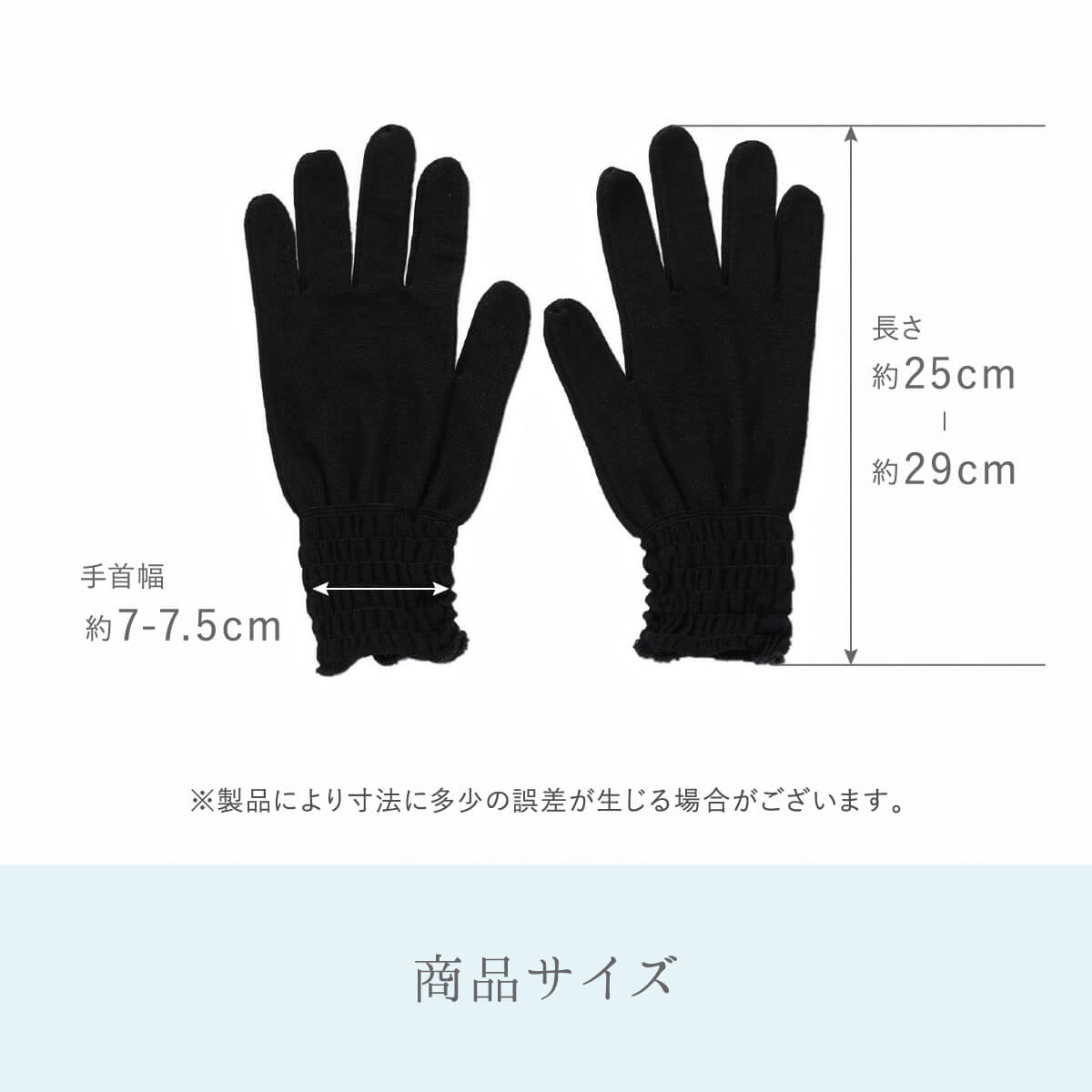 サイズに個体差があります。製品の特性上、指先の端糸やゴム糸が出ることがありますが、引っ張らず適度な長さで切るか、内側に引き入れてください。
