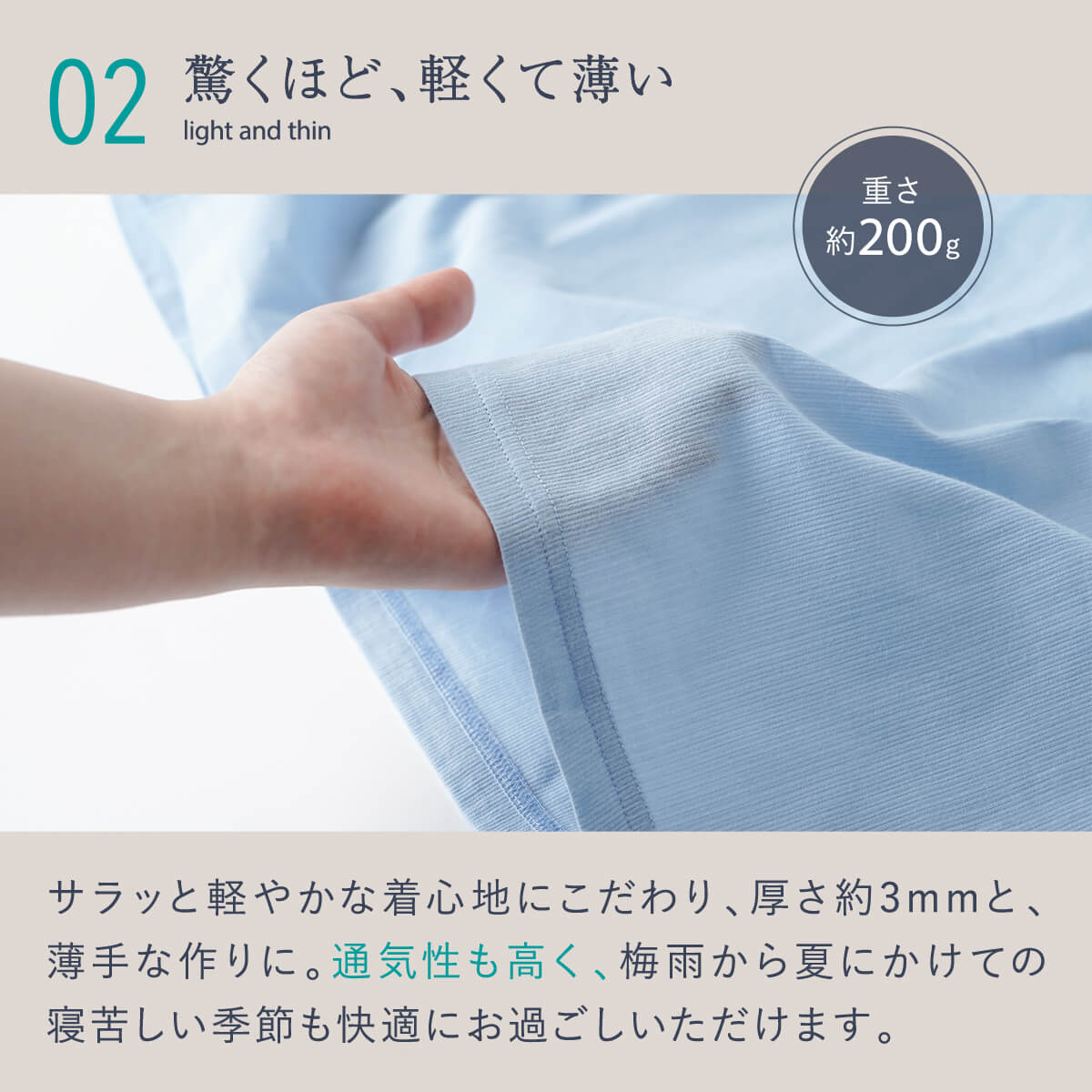 涼綿には独特の深い凹凸(シボ)があり、肌への接触面積が少ないため、汗をかいてもベタつかず、サラッと快適。 お風呂上がりや寝ている間も蒸れを防いで、ストレスフリーな着心地。