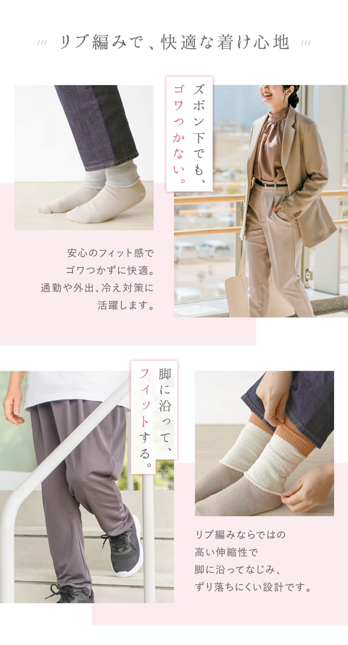 リブ編みで伸縮性があり、