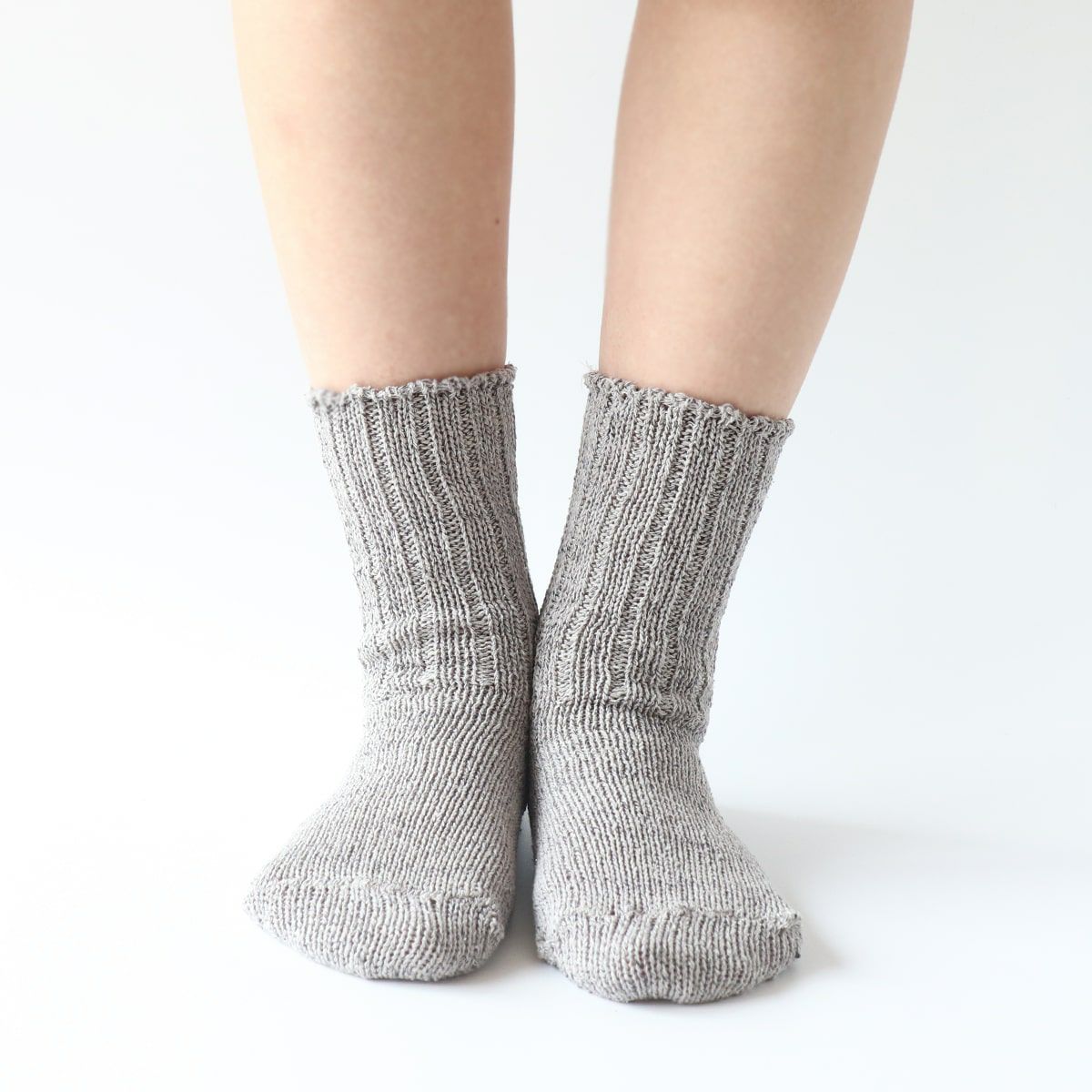 お風呂上がりの足でもシルクが素早く 水気を吸い取り、放湿するので 蒸れずにやさしいあたたかさを保ちます。 履き口に数本しかゴムを入れず、 締め付け感をなるべくなくして やさしい履き心地にこだわりました。