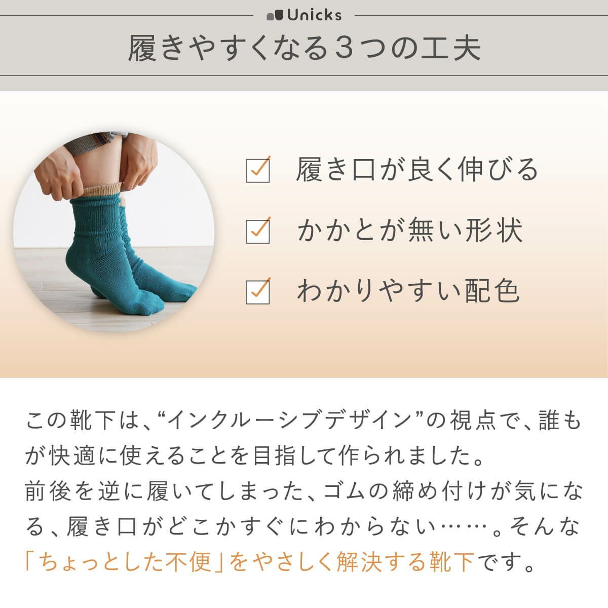 誰でも使いやすいインクルーシブデザインの靴下です。