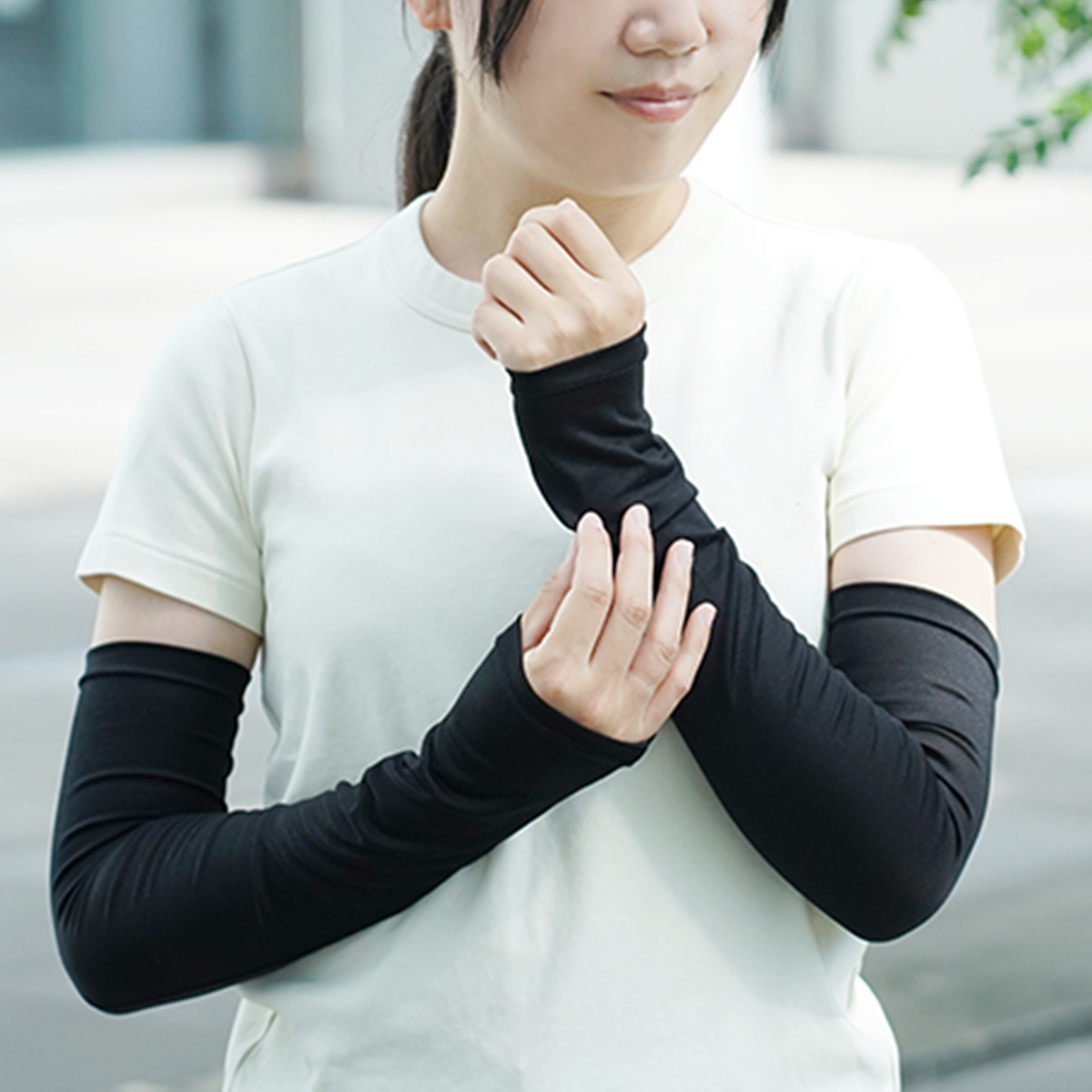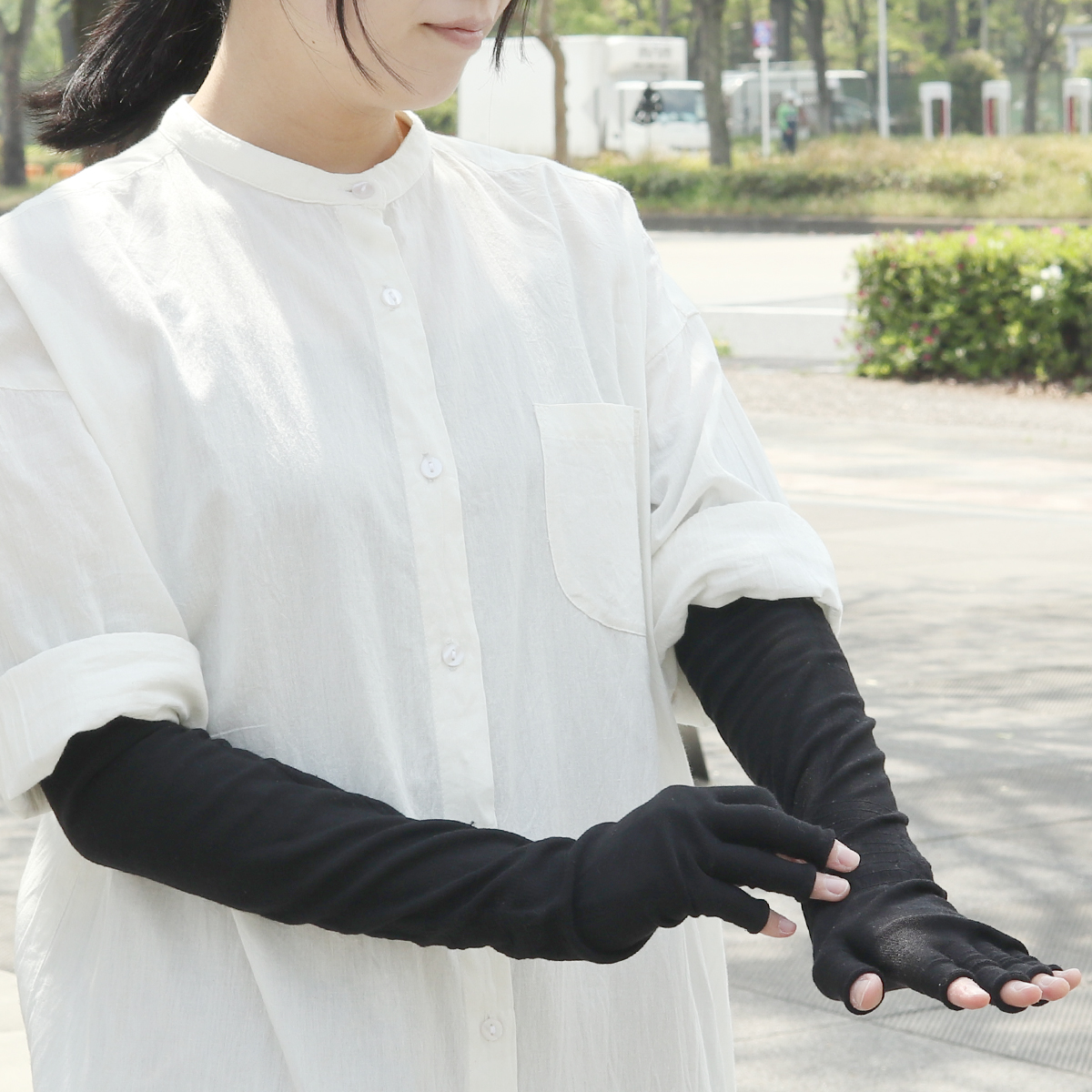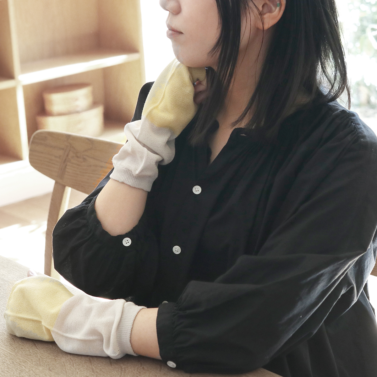 さらりと涼しいアームカバー内側にシルク、外側はシャリ感のあるコットンで、爽やかな肌触り。ゆったりした着け心地で通気性があり、汗によるベタつきを防ぎます。