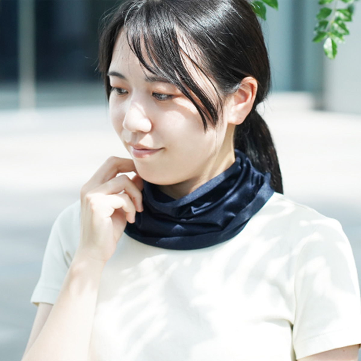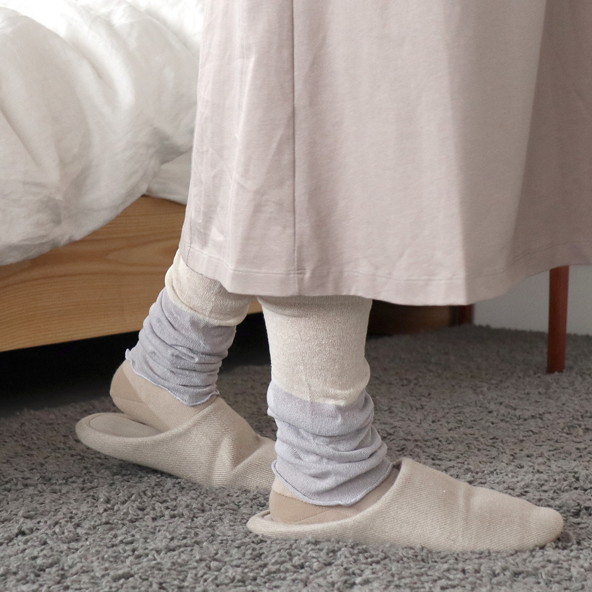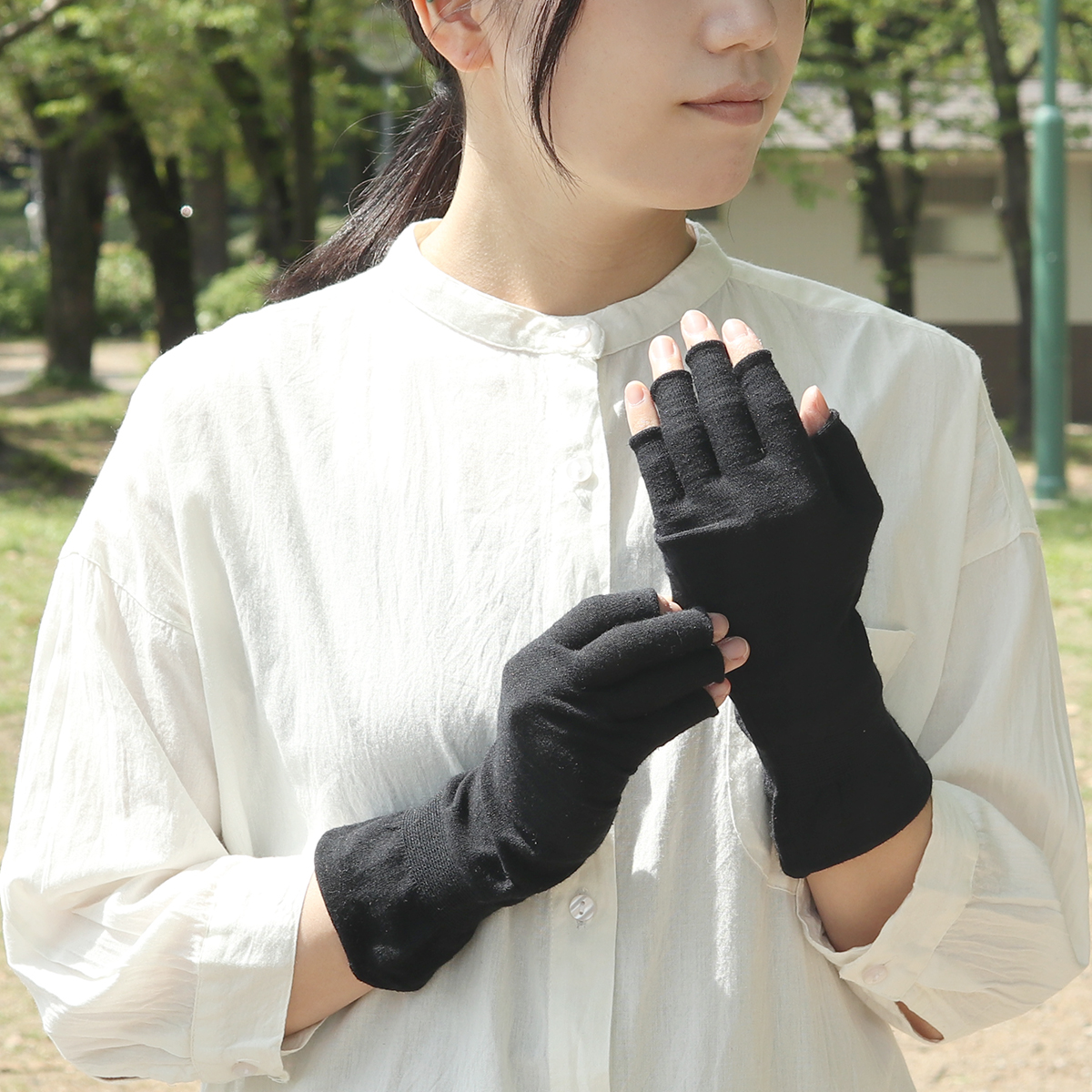 さらりと涼しいアームカバー内側にシルク、外側はシャリ感のあるコットンで、爽やかな肌触り。ゆったりした着け心地で通気性があり、汗によるベタつきを防ぎます。